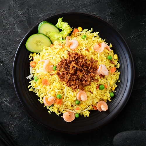 Asisjká smažená rýže s kuřecím nebo hovězím nebo krevetami nebo tofu prsíčkem a sázeným vejcem. Jasmínová rýže, kuřecím nebo hovězím nebo krevetami nebo tofu, vajíčko, červená cibule, mrkev, červená paprika, fazolové lusky, smažená cibulka, jarní cibulka, koriandr (1, 3, 6, 14). Určeno k okamžité spotřebě.