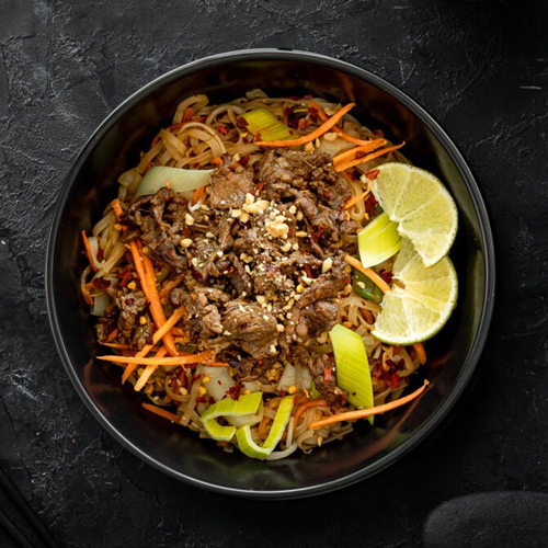 Populární thajské nudle s hromadou zeleniny a masem dle vašeho výběru. Thajské rýžové nudle, hovězí nebo krevety nebo tofu nebo kuřecí roštěná, mrkev, pórek, sójové klíčky, vejce. Podáváme s chilli, arašídy a limetkou (1, 3, 5, 6, 14). Určeno k okamžité spotřebě.
