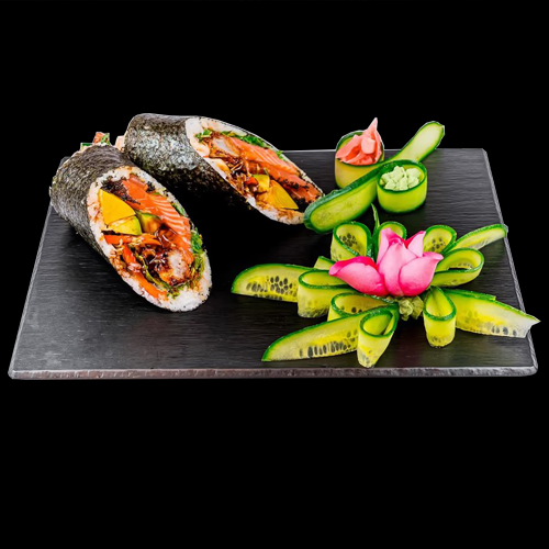 řasa nori, rýže, losos nebo EBI nebo teka nebo kani nebo tempura krevety nebo tempura kuřecí, sezam, ledový salát, rukola, kaviár, žlutá ředkev, avokádo, okurka, omáčky lemon mayo a honey teriyaki