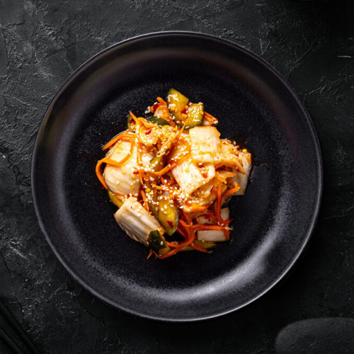 Malý salátek z chilli, koriandru, mrkve, okurky, zelí a sezamu. Určeno k okamžité spotřebě.
