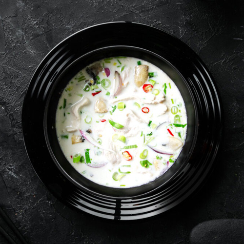 Thajská kuřecí polévka Tom Kha Gai. Kokosové mléko, kuřecí maso, citronová tráva, koření galangal, chilli, žampión, červená cibule, koriandr. (3, 4). Určeno k okamžité spotřebě.