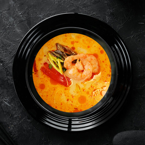 Thajské polévka s kokosovým mlékem a krevetami nebo kuřecí masem nebo tofu. Polévka Tom Yum, krevetami nebo kuřecí masem nebo tofu, vejce, rajčata, jarní cibulka, koriandr. (3, 4) Určeno k okamžité spotřebě.