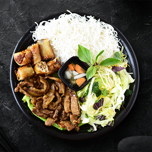 Oblíbený Vietnamský nudlový salát s křupavým vepřovým bůčkem s Jarní závitky. Čínské rýžové nudle, mrkev, ředkev, vepřový bůček, jarní závitky, ledový salát, okurka, sójové klíčky, arašídy, smažená cibulka, koriandr (1, 4, 5, 6). Podáváme se zálivkou Bun (4). Určeno k okamžité spotřebě.