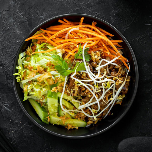 Oblíbený vietnamský nudlový salát s hovězí nebo kuřecí nebo tofu roštěnou. Čínské rýžové nudle, mrkev, ředkev, hovězí nebo kuřecí nebo tofu roštěná, ledový salát, okurka, sójové klíčky, arašídy, smažená cibulka, koriandr (1, 4, 5, 6). Podáváme se zálivkou Bun (4). Určeno k okamžité spotřebě.