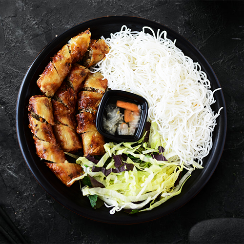 Oblíbený Vietnamský nudlový salát s Jarní závitky. Čínské rýžové nudle, mrkev, ředkev, jarní závitky, ledový salát, okurka, sójové klíčky, arašídy, smažená cibulka, koriandr (1, 4, 5, 6). Podáváme se zálivkou Bun (4). Určeno k okamžité spotřebě.
