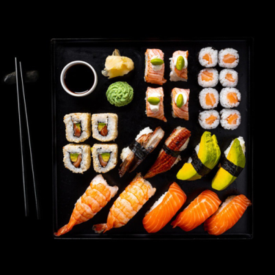 Sushi set obsahuje 25 ks – 3x nigiri losos (4), 2x nigri kreveta (2), 2x nigiri avokádo, 2x nigiri úhoř (4), 4ks Funtastic sushi roll (4, 11), 8 ks maki losos (4), 4 ks Kings roll (1, 2, 4, 6, 7). Podáváme se 3x sójovou omáčkou (1,6), 3x wasabi a 3x zázvorem. Složení: sushi rýže, losos, kreveta, avokádo, marinovaný úhoř, tempura, Philadelphia sýr, nori řasa, edamame, sezam. Určeno k okamžité spotřebě.
