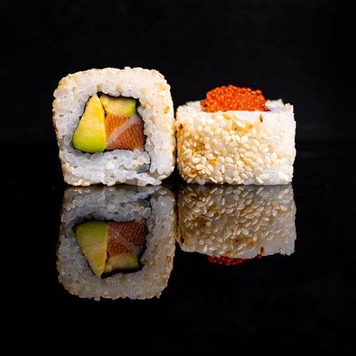 Obrácené sushi – přílohy. Podáváme se sójovou omáčkou (1, 6) , wasabi (10) a zázvorem. Určeno k okamžité spotřebě.