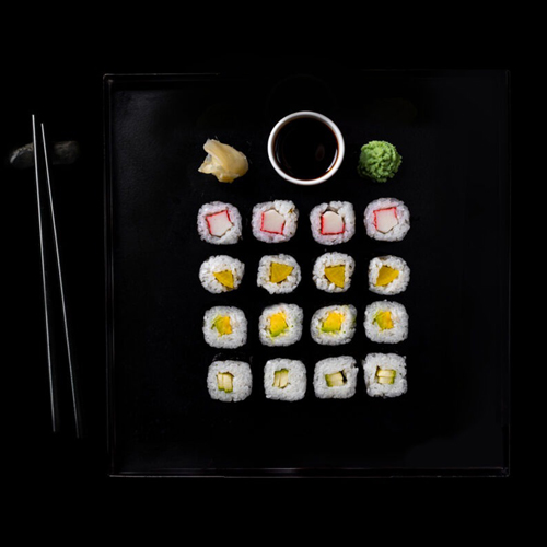 Sushi set obsahuje 16 ks – 4x Maki okurka, 4x Maki avokádo, 4x Maki žlutá ředkev, 4x Maki krabí tyčinka (1, 2, 3, 4, 6). Podáváme se sojovou omáčkou (1, 6), wasabi a zázvorem. Složení: sushi rýže, okurka, avokádo, žlutá ředkev, krabí tyčinka, nori řasa. Určeno k okamžité spotřebě.