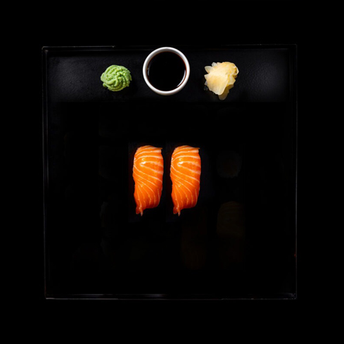 2 ks nigiri s příloha. Podáváme se sójovou omáčkou (1, 6), wassabi a zázvorem. Složení: příloha, nori řasa. Určeno k okamžité spotřebě.