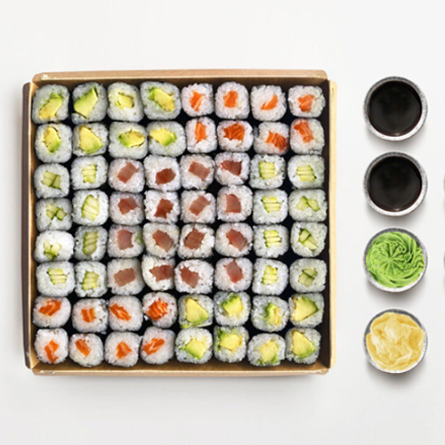 Čeká na Vás 16 ks maki losos (4), 16 ks maki avokádo, 16 ks maki tuňák (4) a 16 ks maki okurka. V boxu najdete sójové omáčka (1, 6), wasabi a zázvor.