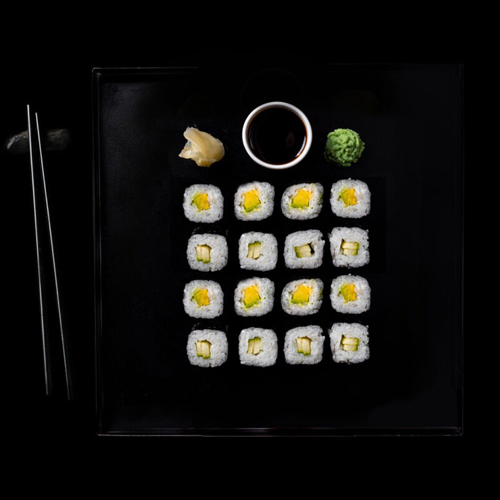 Sushi set obsahuje 16 ks – 8 ks Maki okurka, 8 ks Maki avokádo. Podáváme se sojovou omáčkou (1,6), wasabi a zázvorem a malým míchaným salátkem. Složení: sushi rýže, okurka, avokádo, nori řasa. Určeno k okamžité spotřebě.